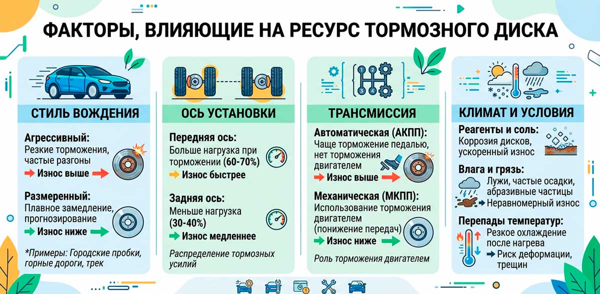 Стиль вождения — главный фактор. Агрессивные торможения с высоких скоростей разогревают диск до 400–600°C, после чего он резко остывает. Такие перепады температур деформируют металл значительно быстрее плавной городской езды.