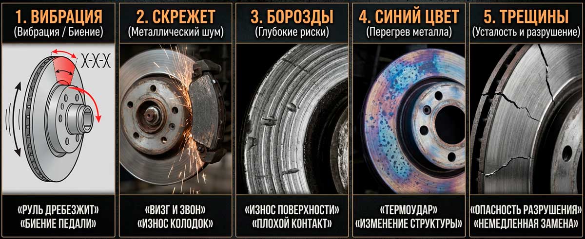 Любые трещины — однозначный сигнал к немедленной замене. Эксплуатация треснувшего диска критически опасна: при следующем интенсивном торможении диск может разрушиться.